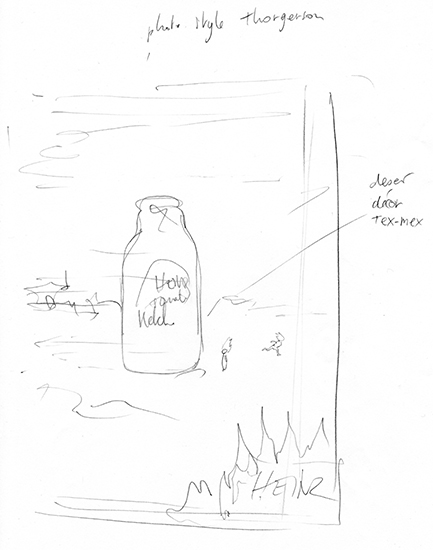 Brief : Publicité pour le nouveau ketchup épicé. Affiche façon Thorgerson. Il fait très chaud. La tête des 2 personnages flambe. Le logo de l'annonceur s'affiche sur fond de feu en avant-plan.